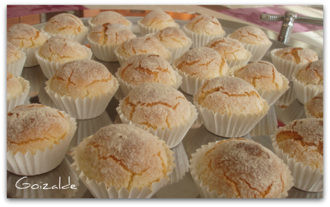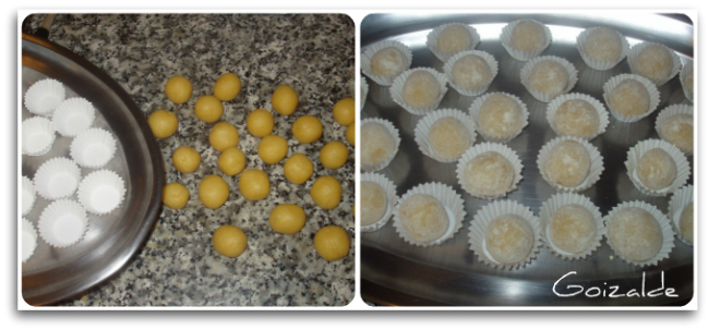 Al día siguiente precalentar el horno a 200ºC. Hacer bolitas (algo más pequeñas que una nuez, han de entrar bien en las cápsulas de mini-magdalenas o de trufas). Rebozar con el azúcar glas reservado y colocar en las capsulitas.