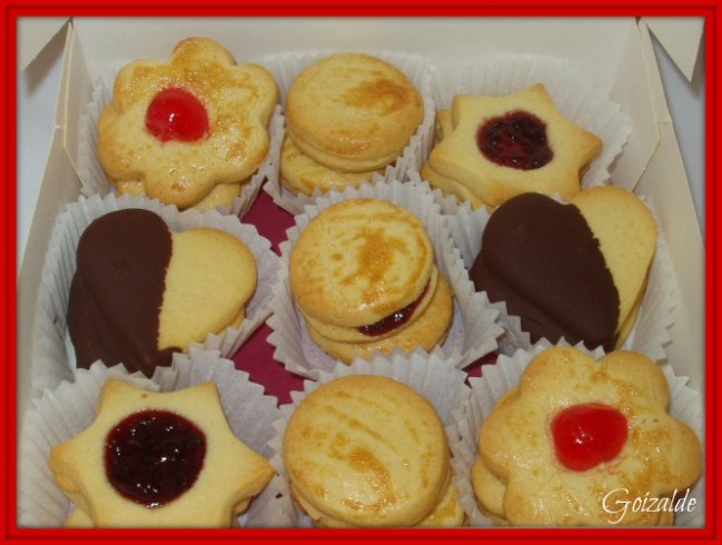 - Con mermelada: a mi personalmente, me gusta poner mermeladas de sabor fuerte (moras, frambuesas, frutos del bosque...) y además porque les da un colorido muy bonito. En mi caso, yo horneo las pastas después de ponerles la mermelada (con la mermelada puesta), de esta forma consigo que la mermelada se seque un pelín y quede más fijada a la pasta.