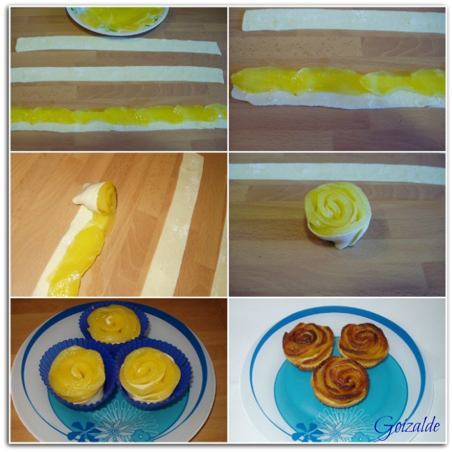 Una vez tengamos el hojaldre estirado o la lámina, iremos cortando tiras de unos 2-3 cm de ancho y utilizamos toda la largura de la lámina (unos 30-35 cm). Colocamos sobre cada tira los gajos de manzana, de tal forma que se solapen un poquito unas con otras. Enrollamos con cuidado de que no se escape la manzana e intentando cerrar un poco la base, dándole forma como de cono. Metemos cada flor en un molde de silicona para magdalenas o en moldes antiadherentes tipo flaneras o incluso en moldes de papel para magdalenas.