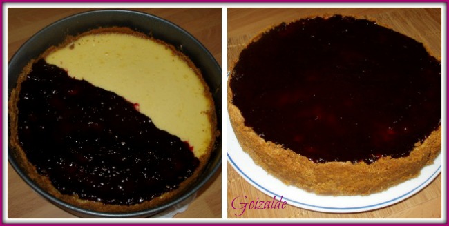 Verter la mezcla en el molde y hornear unos 35-40 min a 170ºC. Dejar que la tarta se enfríe dentro del horno (unas 2-3 horas) y meter a la nevera. Cuando esté bien fría, poner una capa generosa de mermelada de moras.