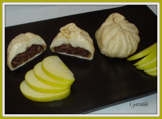Iban nos ofrece una masa de pan esta vez sin hornear, cocinada al vapor con un montón de posibilidades de relleno. En mi caso es un relleno muy fácil y rápido: morcilla y manzana.