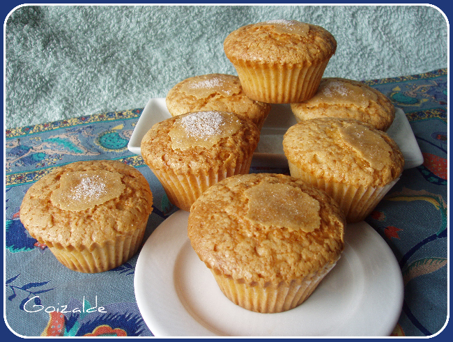 Poner moldes de papel dentro de otro de silicona o de metal (para que se sujeten mejor, ya que solo con el papel acaban abriéndose y no suben). Rellenar con la masa un poco más de la mitad del molde de papel, espolvorear con azúcar en grano la superficie de las magdalenas y hornear 40 min a 160ºC.