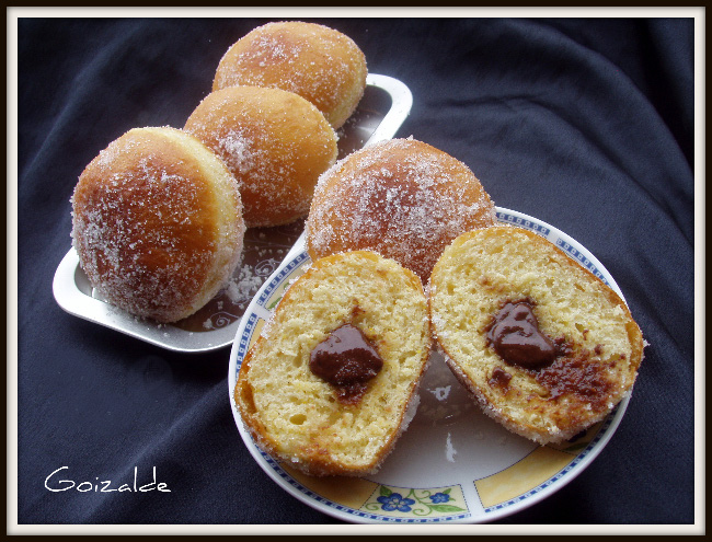 Hola Goizalde,como te dije he hecho este finde las berlinesas de chocolate,están espectaculares de buenas,madre mía!!Hize el doble de la receta,y lo que te comenté del relleno,me acordé que tenía una receta parecida a esta, que venía un relleno de chocolate que se ponía al darle forma al bollito,así que lo hize así,y me quedó muy bien,por lo menos para mi gusto;te digo como lo hize por si tú quieres probar a hacerlo así y ves el resutado:puse a cocer 200 ml.de nata y cuando coció la aparté y le añadí 70 grs.de cobertura de chocolate,le dí con una barilla hasta que se disolvió el chocolate y se mezcló todo bien;vacié esta mezcla en un bol cuadrado untado con un poquitín de aceite y lo puse en el frigo a enfriar,una vez frío lo fue cortando con un cuchillo en pastillas;cuando ya estaba haciendo las bolitas de las berlinesas,fuí poniéndole el chocolate,con la pegadura hacia abajo y bien selladita,de alguna al freirlas se me salió un poquito,pero no pasa nada,puse bastante chocolate,y del aceite se quita muy bien con una espumadera,y me quedaron espectaculares,a todos nos encantaron.Chocolate me sobró,pero lo dejas en el frigo y dura mucho tiempo.Probé a congelar algunas,para ver como quedaban,la pena es que al rato de descongelarlas se absorbe el azúcar,pero siguen estando muy buenas también.He publicado una foto en tu página del facebook,y en la de Ana Sevillla también,espero que no te importe,no me había dado cuenta que tú también tenías página en el facebook.No tardaré mucho en repetirlas,porque ya me están diciendo que las vuelva a hacer para no perder la práctica,jaja…,un saludo!!!