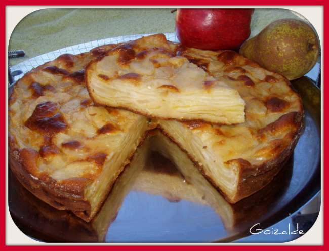Pelar, descorazonar y cortar las manzanas y las peras en lonchas lo más finas posibles, si se tiene mandolina, mejor (yo lo hice a cuchillo y quedaron bastante finas). Cuanto más delgadas sean las lonchas, más fina y rica sale la tarta. Poner la manzana en uno de los boles con la mezcla anterior y la pera en el otro. Mezclar bien con las manos bien limpias.En el fondo de un molde redondo ligeramente engrasado colocar la mezcla de manzana, alisar con una cucharilla y colocar encima la mezcla de la pera.