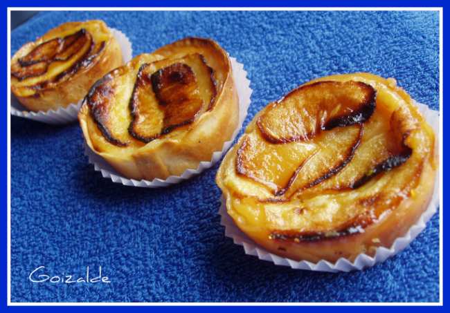Colocar las obleas en los moldes, rellenar con la crema pastelera fría o templada y colocar encima los gajos de manzana. Cocer en el horno unos 20-30 min hasta que se ablanden y doren las manzanas. Como veréis estos pastelitos no necesitan que la base se hornee previamente, se cocina perfectamente en este tiempo.