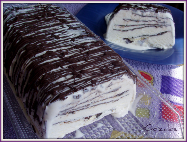 Una vez lista la crema del helado y las láminas de chocolate, procederemos al montado: echaremos un poco de la crema en la base del molde hasta cubrir bien la base, sobre la crema pondremos una lámina de chocolate (si está muy frío, congelado, se despega muy bien del papel de horno), luego cubrir con crema, otra vez chocolate y así hasta terminar con una capa de crema. Se pueden hacer tantas capas como se desee.