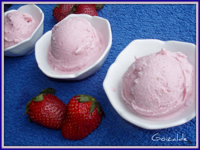 Poner las fresas congeladas en el vaso y triturar 20 seg en vel 6, agregar el resto de los ingredientes y batir 20 seg en vel 6. Verter en un tupper y meter al congelador, cuando pasen 2 horas, volver a poner la mezcla en el vaso y batir 20 seg en vel 6. Congelar de nuevo y ya tenemos listo el helado.