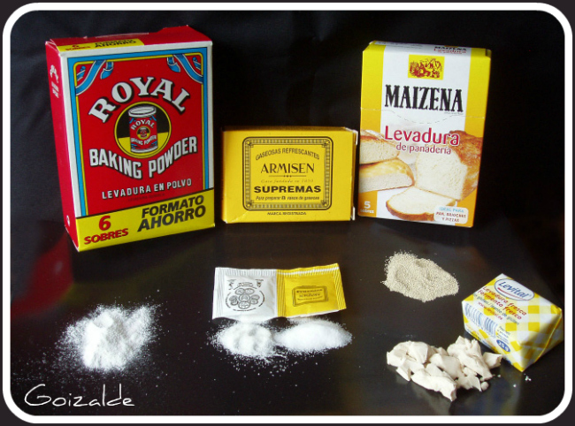 Levaduras químicas o polvos de hornear: se les llama levaduras porque hacen que suban las masas, pero en realidad no lo son, son gasificantes. El calor y la humedad de la preparación hacen que reaccione el gasificante con el acidulante haciendo que la masa se expanda. Son las levaduras tipo Royal (la del paquete rojo) y las gaseosas de la marca Armisen, el Tigre, etc. El bicarbonato también tiene este efecto.